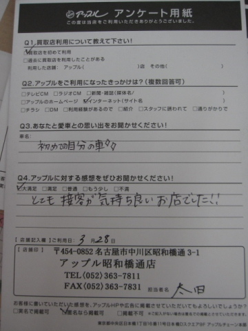 お車のご相談・ 査定だけでもOK! カンタン 入力 30秒 アップルがブランド買取始めました! お電話でも受付中! 受付時間10:00 ~ 19:00 052-363-7811 お車のご相談・ 査定だけでもOK! カンタン 入力 30秒 アップルがブランド買取始めました! お電話でも受付中! 受付時間10:00 ~ 19:00 052-363-7811 アップルがブランド買取始めました! お電話でも受付中! 受付時間10:00 ~ 19:00 052-363-7811 店舗情報 在庫車 スタッフ紹介 ブログ お客様の声 キャンペーン 無料査定 click お客様の声 ご記入日: 2017/06/06 匿名希望アテンザ様 とても接客が気持ちよいお店でした!! 前へ 次へ お客様の声一覧を見る