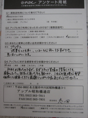 お車のご相談・ 査定だけでもOK! カンタン 入力 30秒 アップルがブランド買取始めました! お電話でも受付中! 受付時間10:00 ~ 19:00 052-363-7811 お車のご相談・ 査定だけでもOK! カンタン 入力 30秒 アップルがブランド買取始めました! お電話でも受付中! 受付時間10:00 ~ 19:00 052-363-7811 アップルがブランド買取始めました! お電話でも受付中! 受付時間10:00 ~ 19:00 052-363-7811 店舗情報 在庫車 スタッフ紹介 ブログ お客様の声 キャンペーン 無料査定 click お客様の声 ご記入日: 2017/06/06 匿名希望プリウス様 初めて利用したのですが、まずスタッフ皆様の接客にとても感想しました。担当していただいた方も親切で、こちらの無理な希望価格にも頑張って下さり感謝いっぱいです。ありがとうございました。 前へ 次へ お客様の声一覧を見る