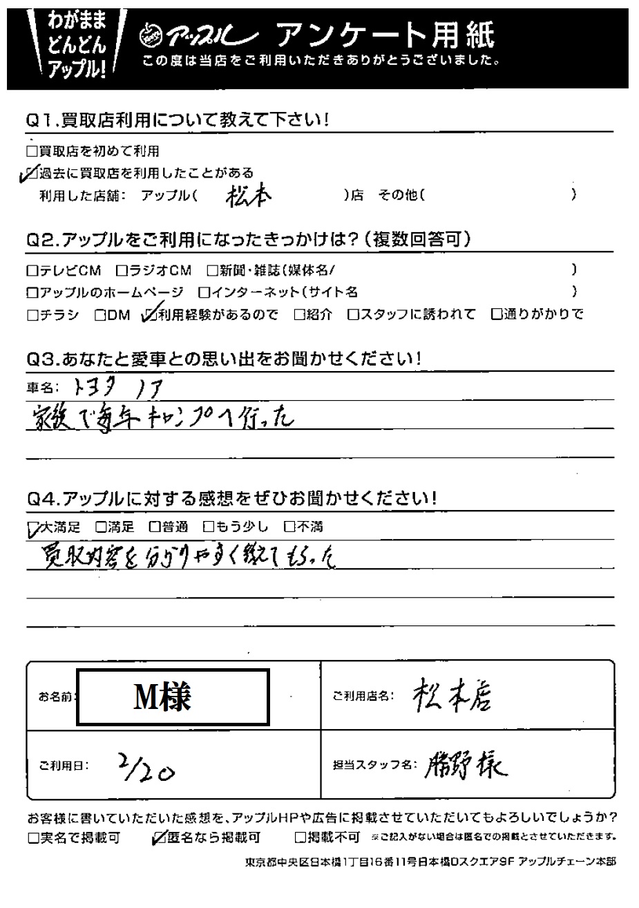 お車のご相談・ 査定だけでもOK! カンタン 入力 30秒 アップルがブランド買取始めました! お電話でも受付中! 受付時間10:00 ~ 19:00 0263-24-2433 お車のご相談・ 査定だけでもOK! カンタン 入力 30秒 アップルがブランド買取始めました! お電話でも受付中! 受付時間10:00 ~ 19:00 0263-24-2433 アップルがブランド買取始めました! お電話でも受付中! 受付時間10:00 ~ 19:00 0263-24-2433 店舗情報 在庫車 スタッフ紹介 ブログ お客様の声 キャンペーン 無料査定 click お客様の声 ご記入日: 2021/02/20 M様 車名:トヨタ ノア 感想:大満足買取内容も分かりやすく教えてもらった。 前へ 次へ お客様の声一覧を見る