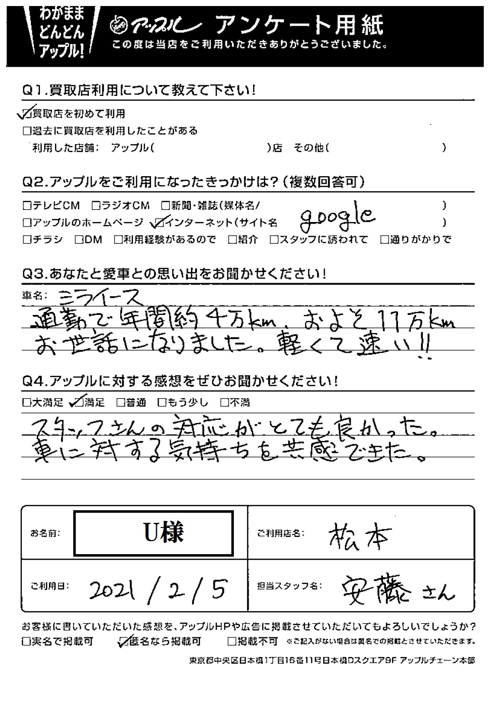 お車のご相談・ 査定だけでもOK! カンタン 入力 30秒 アップルがブランド買取始めました! お電話でも受付中! 受付時間10:00 ~ 19:00 0263-24-2433 お車のご相談・ 査定だけでもOK! カンタン 入力 30秒 アップルがブランド買取始めました! お電話でも受付中! 受付時間10:00 ~ 19:00 0263-24-2433 アップルがブランド買取始めました! お電話でも受付中! 受付時間10:00 ~ 19:00 0263-24-2433 店舗情報 在庫車 スタッフ紹介 ブログ お客様の声 キャンペーン 無料査定 click お客様の声 ご記入日: 2021/02/05 U様 車名:ダイハツ ミライース 感想:満足スタッフさんの対応がとてもよかった。車に対する気持ちを共感できた。 前へ 次へ お客様の声一覧を見る