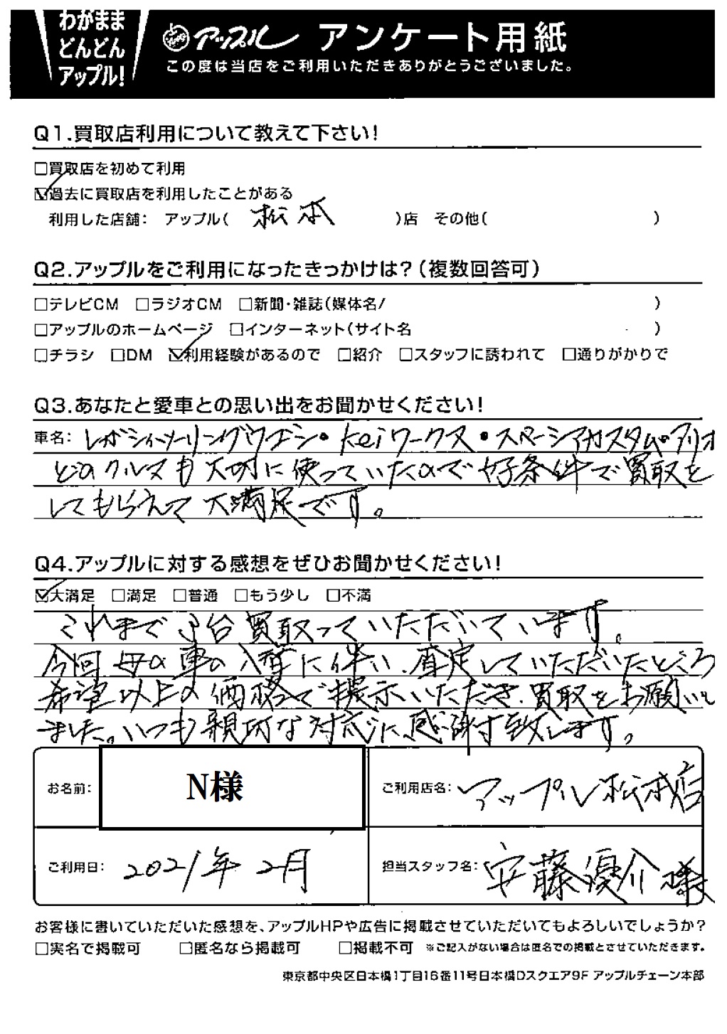 これまで3台買い取っていただいています。今回母の車の入れ替えに伴い、査定していただいたところ希望以上の価格で提示していただき買取をお願いしました。いつも親切な対応に感謝致します。