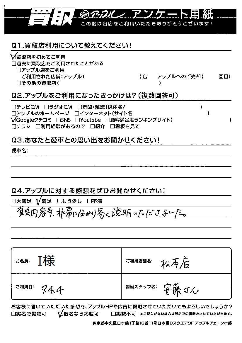 お車のご相談・ 査定だけでもOK! カンタン 入力 30秒 アップルがブランド買取始めました! お電話でも受付中! 受付時間10:00 ~ 19:00 0263-24-2433 お車のご相談・ 査定だけでもOK! カンタン 入力 30秒 アップルがブランド買取始めました! お電話でも受付中! 受付時間10:00 ~ 19:00 0263-24-2433 アップルがブランド買取始めました! お電話でも受付中! 受付時間10:00 ~ 19:00 0263-24-2433 店舗情報 在庫車 スタッフ紹介 ブログ お客様の声 キャンペーン 無料査定 click お客様の声 ご記入日: 2022/04/01 I様 Q アップルに対する感想をぜひお聞かせください!感想:満足査定内容等、非常に分かり易く説明いただきました。 前へ 次へ お客様の声一覧を見る