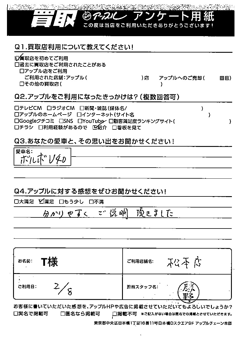 お車のご相談・ 査定だけでもOK! カンタン 入力 30秒 アップルがブランド買取始めました! お電話でも受付中! 受付時間10:00 ~ 19:00 0263-24-2433 お車のご相談・ 査定だけでもOK! カンタン 入力 30秒 アップルがブランド買取始めました! お電話でも受付中! 受付時間10:00 ~ 19:00 0263-24-2433 アップルがブランド買取始めました! お電話でも受付中! 受付時間10:00 ~ 19:00 0263-24-2433 店舗情報 在庫車 スタッフ紹介 ブログ お客様の声 キャンペーン 無料査定 click お客様の声 ご記入日: 2025/02/08 T様 車名:ボルボ V40 ご利用日:2025年2月8日担当:勝野Q:アップルに対する感想をぜひお聞かせください!!A:満足 分かりやすく、ご説明頂きました。 前へ 次へ お客様の声一覧を見る