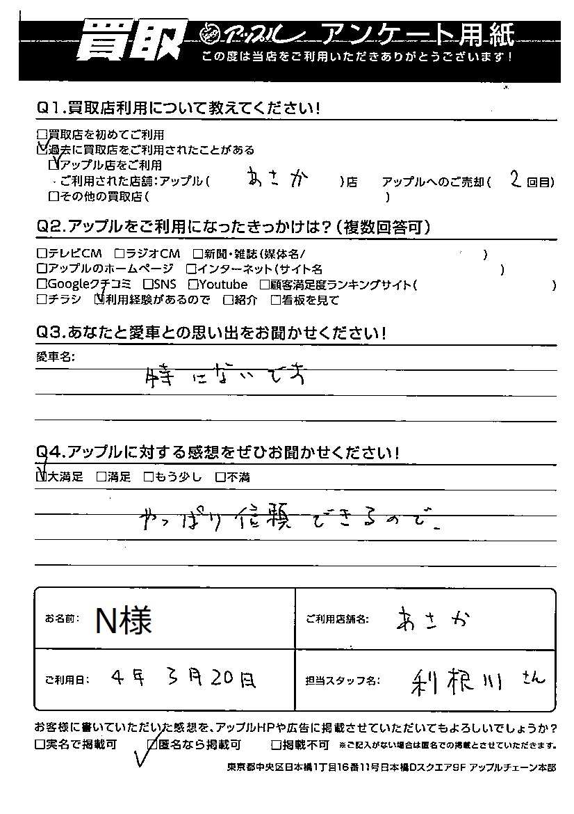 お車のご相談・ 査定だけでもOK! カンタン 入力 30秒 アップルがブランド買取始めました! お電話でも受付中! 受付時間10:00 ~ 19:00 048-451-1055 お車のご相談・ 査定だけでもOK! カンタン 入力 30秒 アップルがブランド買取始めました! お電話でも受付中! 受付時間10:00 ~ 19:00 048-451-1055 アップルがブランド買取始めました! お電話でも受付中! 受付時間10:00 ~ 19:00 048-451-1055 店舗情報 在庫車 スタッフ紹介 ブログ お客様の声 キャンペーン 無料査定 click お客様の声 ご記入日: 2022/03/20 N様 Q アップルに対する感想をぜひお聞かせください!感想:大満足やっぱり信頼できるので 前へ 次へ お客様の声一覧を見る