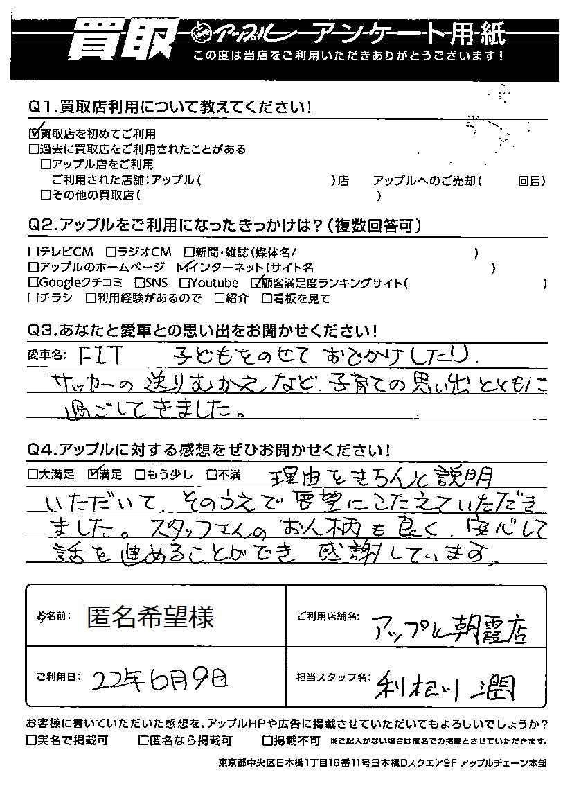 匿名希望様 車名:ホンダ フィット(H25年9月以降のハイブリッド含む)