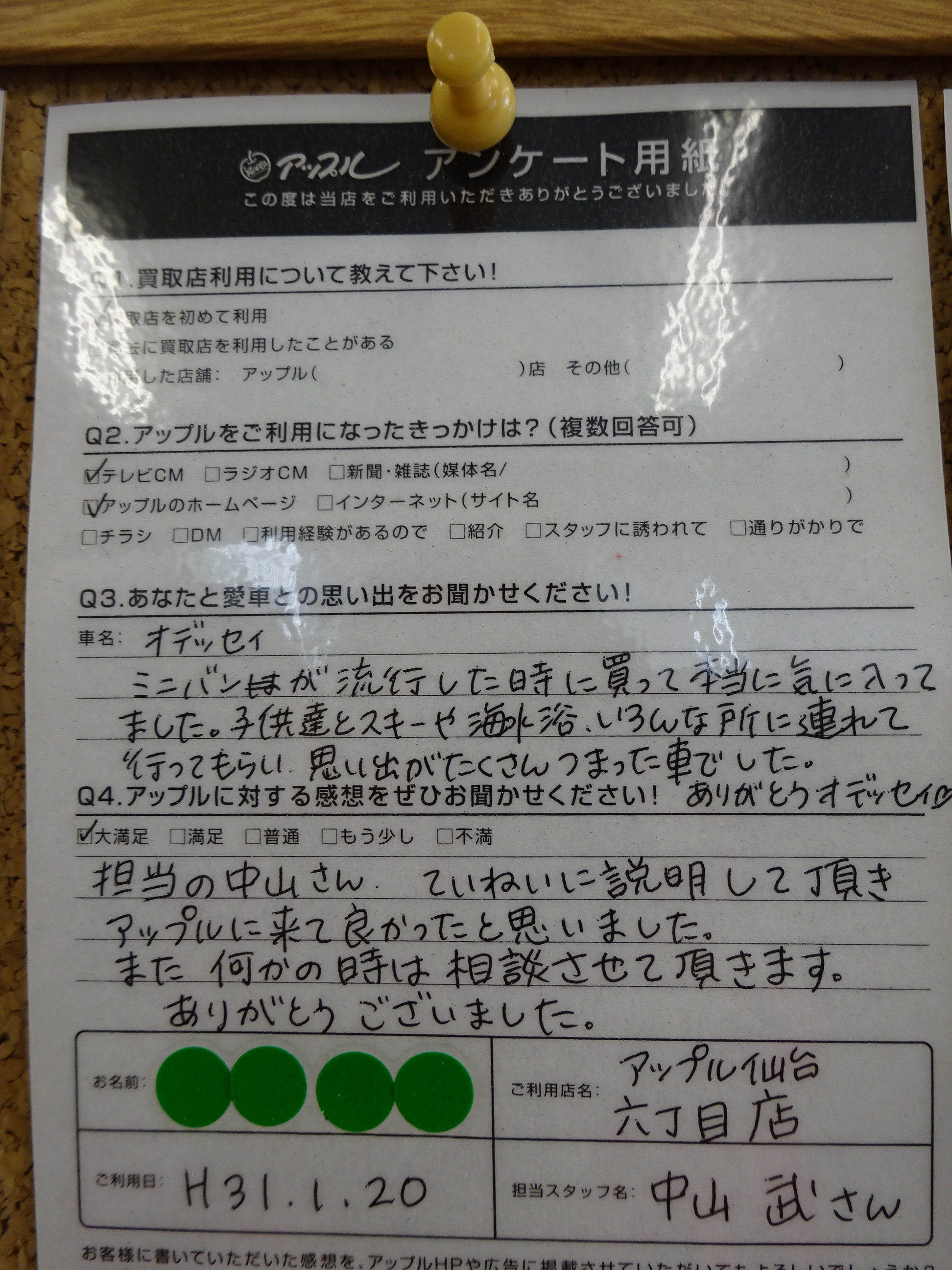 A.ミニバンが流行した時に買って本当に気に入ってました。子供達とスキーや海水浴、いろんな所に連れて行ってもらい、思い出がたくさんつまった車でした。ありがとうオデッセイ