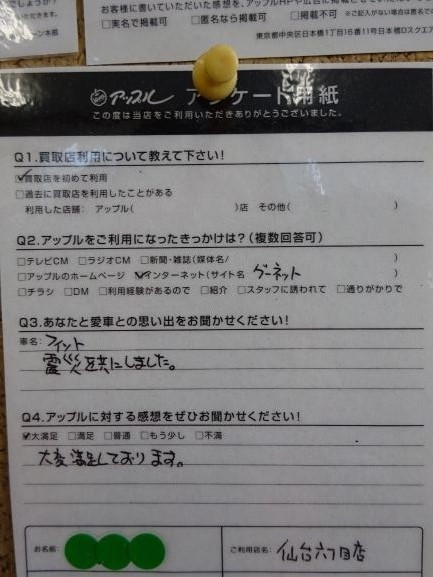 お車のご相談・ 査定だけでもOK! カンタン 入力 30秒 アップルがブランド買取始めました! お電話でも受付中! 受付時間10:00 ~ 19:00 022-782-8933 お車のご相談・ 査定だけでもOK! カンタン 入力 30秒 アップルがブランド買取始めました! お電話でも受付中! 受付時間10:00 ~ 19:00 022-782-8933 アップルがブランド買取始めました! お電話でも受付中! 受付時間10:00 ~ 19:00 022-782-8933 店舗情報 在庫車 スタッフ紹介 ブログ お客様の声 キャンペーン 無料査定 click お客様の声 ご記入日: 2019/03/02 宮城県 匿名希望様 車名:ホンダ フィット(H25年9月以降のハイブリッド含む) Q.愛車との思い出をお聞かせください!A.震災を共にしました。Q.アップルに対する感想をお聞かせください!A.対応に大変満足しております。 前へ 次へ お客様の声一覧を見る
