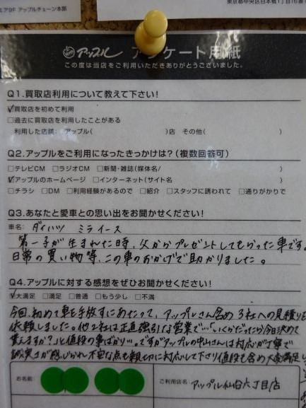A.今回初めて車を手放すにあたって、アップルさん含め3社への見積りを依頼しました。他2社は正直強引な営業で・・・「いくらだったら今日決めてもらえますか?」と値段の事ばかり・・・。ですがアップルの中山さんは対応が丁寧で誠実さが感じられ不安な点も親切に対応して下さり値段も含め大変満足しています。ありがとうございました。