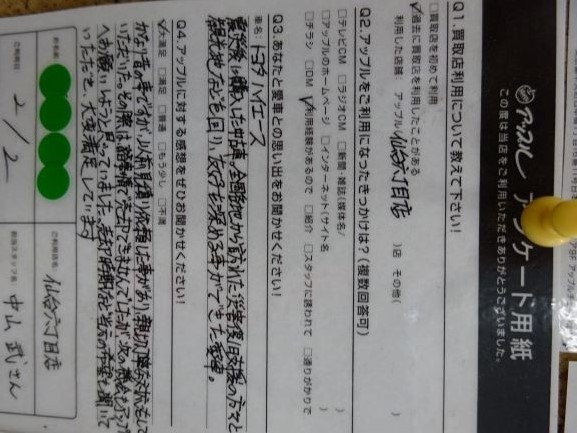 A.かなり昔の車ですが、以前見積り依頼した事があり、親切丁寧な対応をしていただいた。その際は諸事情で売却できませんでしたが、次の機会もアップルへお願いしようと思っていました。売却時期など当方の希望も聞いていただき、大変満足しています。