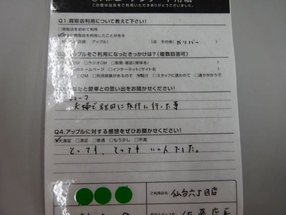 お車のご相談・ 査定だけでもOK! カンタン 入力 30秒 アップルがブランド買取始めました! お電話でも受付中! 受付時間10:00 ~ 19:00 022-782-8933 お車のご相談・ 査定だけでもOK! カンタン 入力 30秒 アップルがブランド買取始めました! お電話でも受付中! 受付時間10:00 ~ 19:00 022-782-8933 アップルがブランド買取始めました! お電話でも受付中! 受付時間10:00 ~ 19:00 022-782-8933 店舗情報 在庫車 スタッフ紹介 ブログ お客様の声 キャンペーン 無料査定 click お客様の声 ご記入日: 2019/03/28 宮城県 匿名希望様 車名:日産 ジューク Q.愛車との思い出をお聞かせください!A.夫婦で秋田に旅行に行った事Q.アップルに対する感想をお聞かせください!A.大満足。とってもとってもいい人でした。 前へ 次へ お客様の声一覧を見る