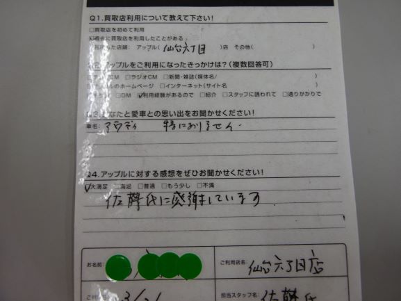 お車のご相談・ 査定だけでもOK! カンタン 入力 30秒 アップルがブランド買取始めました! お電話でも受付中! 受付時間10:00 ~ 19:00 022-782-8933 お車のご相談・ 査定だけでもOK! カンタン 入力 30秒 アップルがブランド買取始めました! お電話でも受付中! 受付時間10:00 ~ 19:00 022-782-8933 アップルがブランド買取始めました! お電話でも受付中! 受付時間10:00 ~ 19:00 022-782-8933 店舗情報 在庫車 スタッフ紹介 ブログ お客様の声 キャンペーン 無料査定 click お客様の声 ご記入日: 2019/02/07 匿名希望様 車名:アウディ Q.アップルに対する感想をお聞かせください!A.大満足。佐藤氏に感謝しています。 前へ 次へ お客様の声一覧を見る