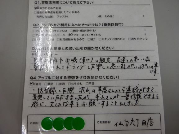 A.大満足。一括登録した際沢山の車屋さんから連絡が来て査定していただきましたが、中山さんが一番信頼できると感じ大切な車をお願いすることにしました。