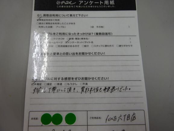 お車のご相談・ 査定だけでもOK! カンタン 入力 30秒 アップルがブランド買取始めました! お電話でも受付中! 受付時間10:00 ~ 19:00 022-782-8933 お車のご相談・ 査定だけでもOK! カンタン 入力 30秒 アップルがブランド買取始めました! お電話でも受付中! 受付時間10:00 ~ 19:00 022-782-8933 アップルがブランド買取始めました! お電話でも受付中! 受付時間10:00 ~ 19:00 022-782-8933 店舗情報 在庫車 スタッフ紹介 ブログ お客様の声 キャンペーン 無料査定 click お客様の声 ご記入日: 2019/01/13 宮城県 匿名希望様 Q.アップルに対する感想をお聞かせください!A.大満足。対応も丁寧に対応して頂き、買取料金も希望通りでした。 前へ 次へ お客様の声一覧を見る