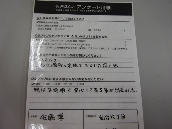 お車のご相談・ 査定だけでもOK! カンタン 入力 30秒 アップルがブランド買取始めました! お電話でも受付中! 受付時間10:00 ~ 19:00 022-782-8933 お車のご相談・ 査定だけでもOK! カンタン 入力 30秒 アップルがブランド買取始めました! お電話でも受付中! 受付時間10:00 ~ 19:00 022-782-8933 アップルがブランド買取始めました! お電話でも受付中! 受付時間10:00 ~ 19:00 022-782-8933 店舗情報 在庫車 スタッフ紹介 ブログ お客様の声 キャンペーン 無料査定 click お客様の声 ご記入日: 2019/03/03 宮城県 匿名希望様 車名:トヨタ エスティマ Q.愛車との思い出をお聞かせください!A.色々な場所へ家族ででかけた思い出。Q.アップルに対する感想をお聞かせください!A.大満足。親切な説明で安心して売る事が出来ました。 前へ 次へ お客様の声一覧を見る