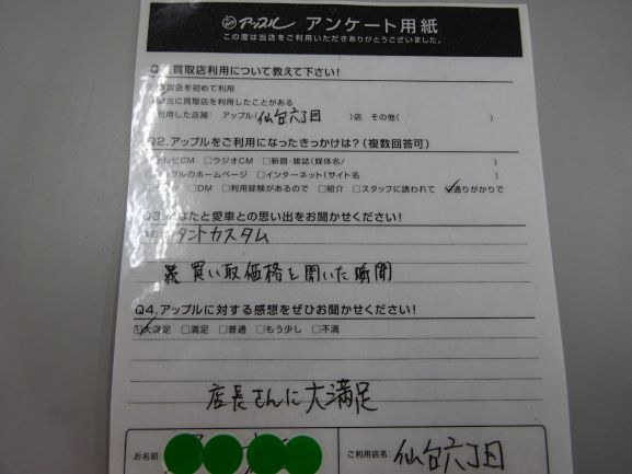 お車のご相談・ 査定だけでもOK! カンタン 入力 30秒 アップルがブランド買取始めました! お電話でも受付中! 受付時間10:00 ~ 19:00 022-782-8933 お車のご相談・ 査定だけでもOK! カンタン 入力 30秒 アップルがブランド買取始めました! お電話でも受付中! 受付時間10:00 ~ 19:00 022-782-8933 アップルがブランド買取始めました! お電話でも受付中! 受付時間10:00 ~ 19:00 022-782-8933 店舗情報 在庫車 スタッフ紹介 ブログ お客様の声 キャンペーン 無料査定 click お客様の声 ご記入日: 2019/02/15 宮城県 匿名希望様 車名:ダイハツ タント Q.愛車との思い出をお聞かせください!A.買取価格を聞いた瞬間Q.アップルに対する感想をお聞かせください!A.大満足。店長さんに大満足 前へ 次へ お客様の声一覧を見る