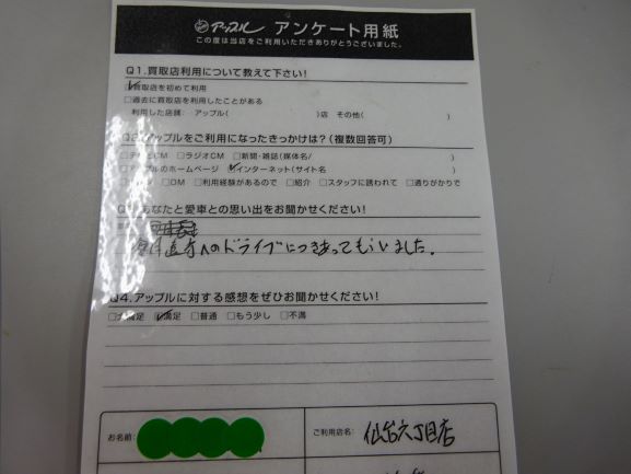 お車のご相談・ 査定だけでもOK! カンタン 入力 30秒 アップルがブランド買取始めました! お電話でも受付中! 受付時間10:00 ~ 19:00 022-782-8933 お車のご相談・ 査定だけでもOK! カンタン 入力 30秒 アップルがブランド買取始めました! お電話でも受付中! 受付時間10:00 ~ 19:00 022-782-8933 アップルがブランド買取始めました! お電話でも受付中! 受付時間10:00 ~ 19:00 022-782-8933 店舗情報 在庫車 スタッフ紹介 ブログ お客様の声 キャンペーン 無料査定 click お客様の声 ご記入日: 2019/01/13 宮城県 匿名希望様 Q.愛車との思い出をお聞かせください!A.毎月遠方へのドライブにつきあってもらいました。Q.アップルに対する感想をお聞かせください!A.満足。 前へ 次へ お客様の声一覧を見る