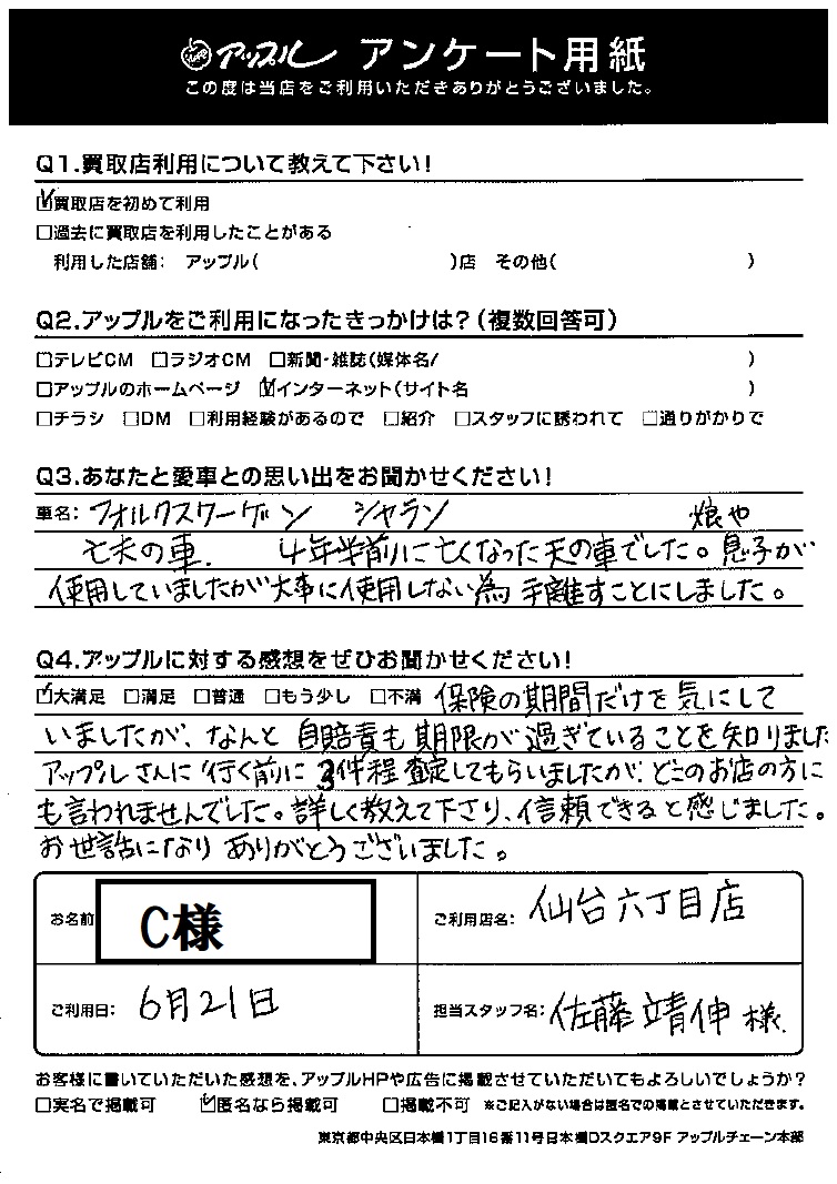 保険の期間だけを気にしていましたが、なんと自賠責も期限が過ぎていることを知りました。アップルさんに行く前に3件程度査定してもらいましたが、どこのお店の方も言われませんでした。詳しく教えてくださり、信頼できると感じました。お世話になり、ありがとうございました。