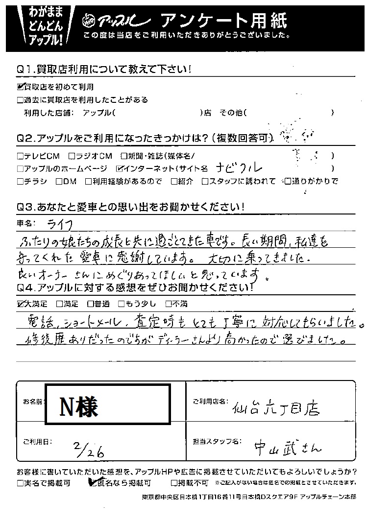 ふたりの娘たちの成長と共に過ごしてきた車です。長い期間、私達を守ってくれた愛車に感謝しております。大切に乗ってきました。良いオーナーさんにめぐりあってほしいと思っています。