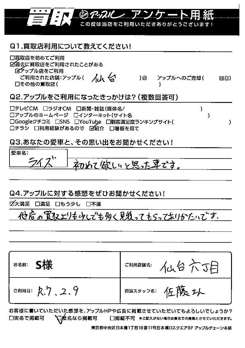 お車のご相談・ 査定だけでもOK! カンタン 入力 30秒 アップルがブランド買取始めました! お電話でも受付中! 受付時間10:00 ~ 19:00 022-782-8933 お車のご相談・ 査定だけでもOK! カンタン 入力 30秒 アップルがブランド買取始めました! お電話でも受付中! 受付時間10:00 ~ 19:00 022-782-8933 アップルがブランド買取始めました! お電話でも受付中! 受付時間10:00 ~ 19:00 022-782-8933 店舗情報 在庫車 スタッフ紹介 ブログ お客様の声 キャンペーン 無料査定 click お客様の声 ご記入日: 2025/02/09 匿名希望 S様 車名:トヨタ ライズ Q:あなたの愛車と、その思い出をお聞かせください!愛車名:ライズ初めてほしいと思った車です。Q:他店の買取よりも少しでも多く見積もってもらってありがたいです。 前へ 次へ お客様の声一覧を見る