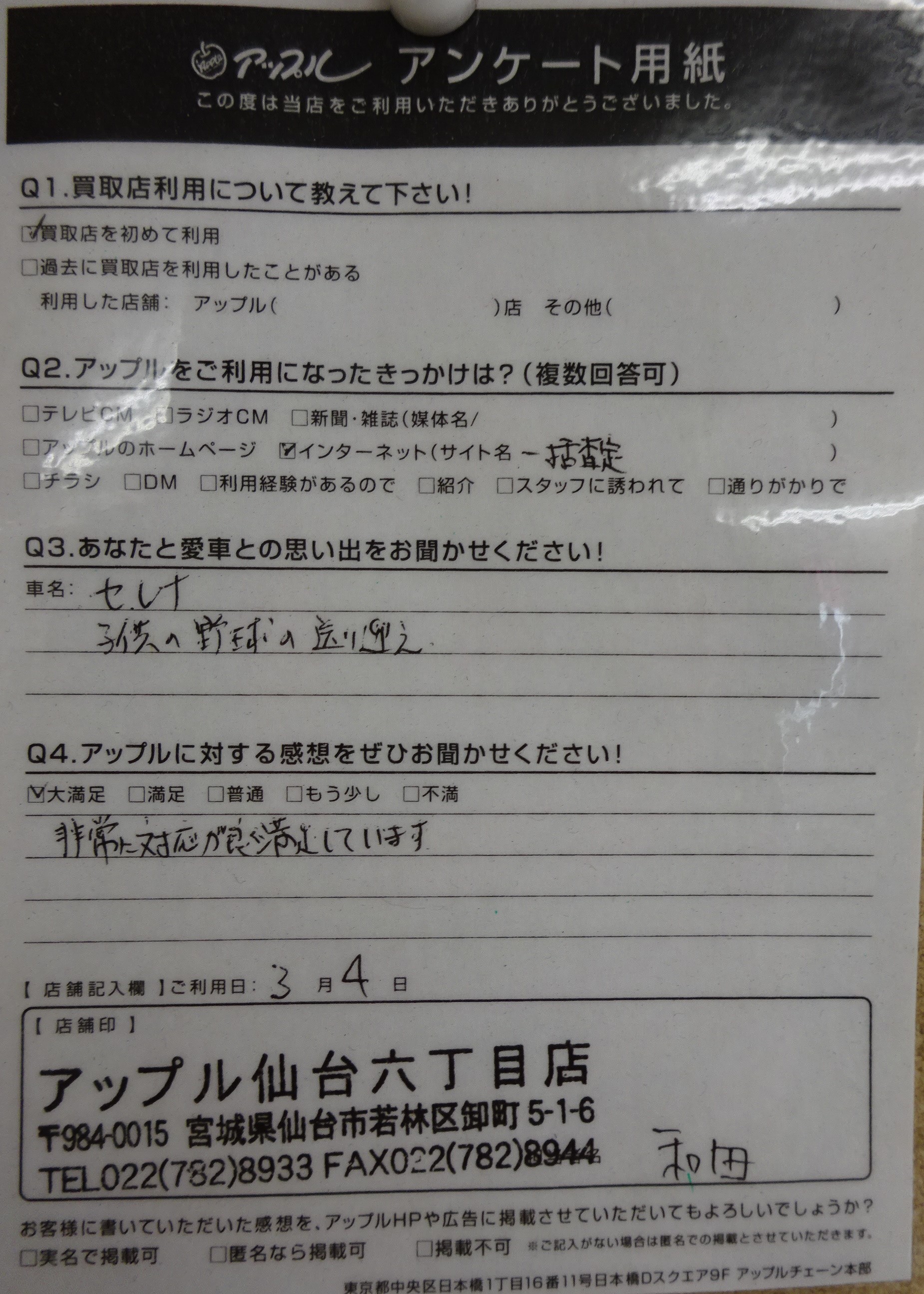 お車のご相談・ 査定だけでもOK! カンタン 入力 30秒 アップルがブランド買取始めました! お電話でも受付中! 受付時間10:00 ~ 19:00 022-782-8933 お車のご相談・ 査定だけでもOK! カンタン 入力 30秒 アップルがブランド買取始めました! お電話でも受付中! 受付時間10:00 ~ 19:00 022-782-8933 アップルがブランド買取始めました! お電話でも受付中! 受付時間10:00 ~ 19:00 022-782-8933 店舗情報 在庫車 スタッフ紹介 ブログ お客様の声 キャンペーン 無料査定 click お客様の声 ご記入日: 2018/03/04 宮城県 匿名希望様 車名:日産 セレナ Q.愛車との思い出をお聞かせください!A.子供の野球の送り迎え。Q.アップルに対する感想をお聞かせください!A.非常に対応が良く満足しています。 前へ 次へ お客様の声一覧を見る