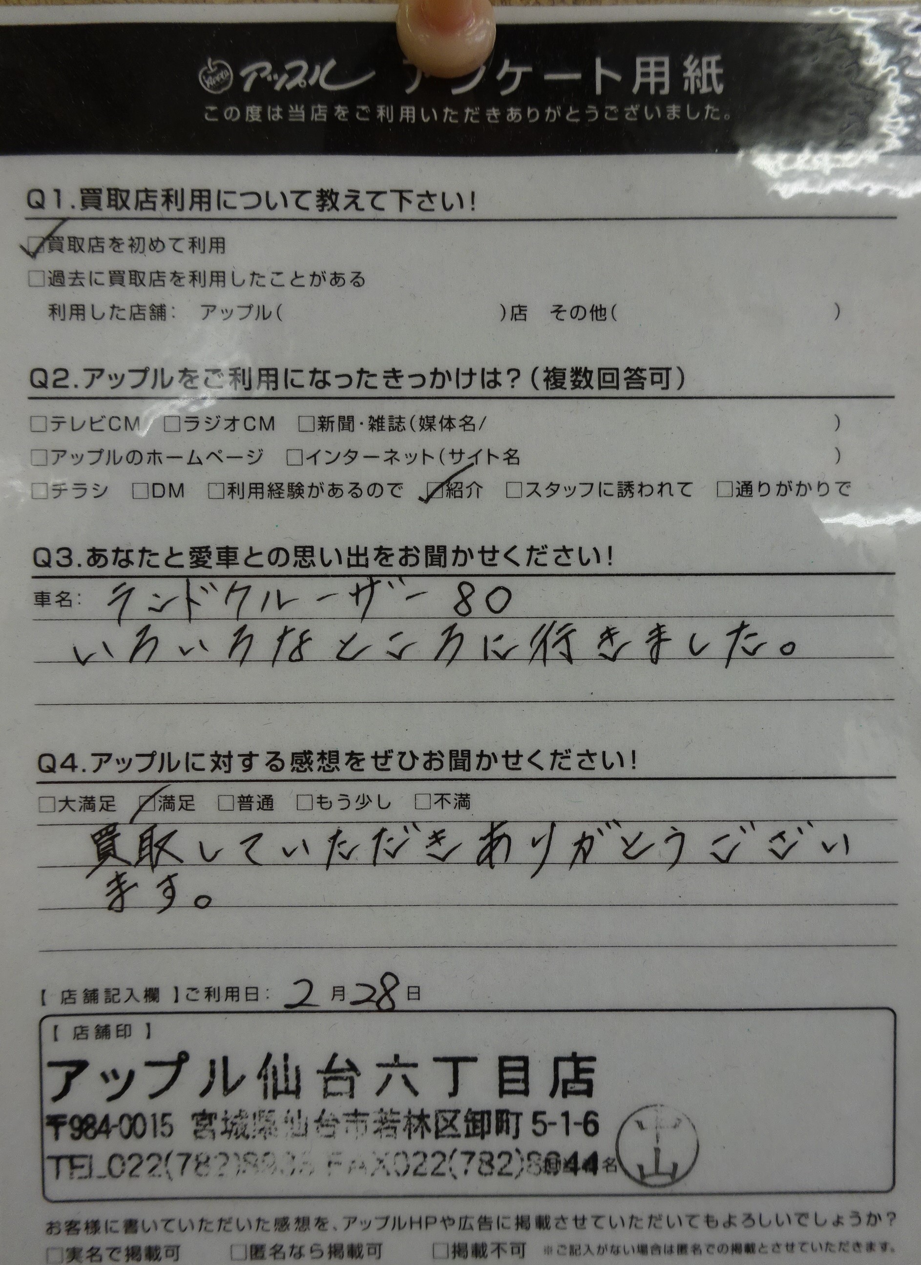 お車のご相談・ 査定だけでもOK! カンタン 入力 30秒 アップルがブランド買取始めました! お電話でも受付中! 受付時間10:00 ~ 19:00 022-782-8933 お車のご相談・ 査定だけでもOK! カンタン 入力 30秒 アップルがブランド買取始めました! お電話でも受付中! 受付時間10:00 ~ 19:00 022-782-8933 アップルがブランド買取始めました! お電話でも受付中! 受付時間10:00 ~ 19:00 022-782-8933 店舗情報 在庫車 スタッフ紹介 ブログ お客様の声 キャンペーン 無料査定 click お客様の声 ご記入日: 2018/02/28 宮城県 匿名希望様 車名:トヨタ ランドクルーザー80(H1年10月~H9年12月) Q.愛車との思い出をお聞かせください!A.色々な所に行きました。Q.アップルに対する感想をお聞かせください!A.買取して頂きありがとうございます。 前へ 次へ お客様の声一覧を見る