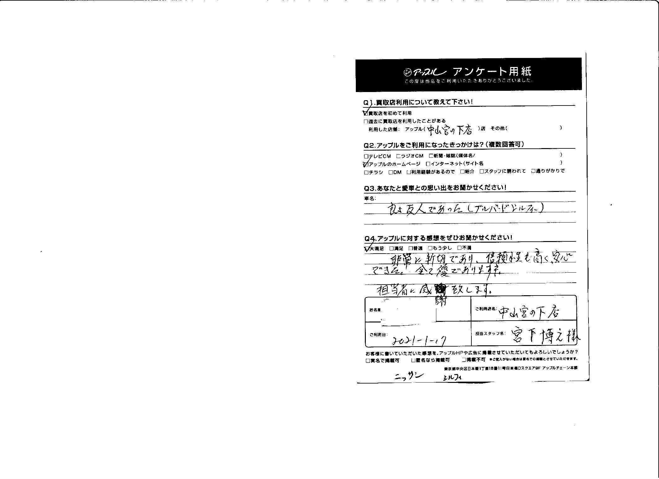 お車のご相談・ 査定だけでもOK! カンタン 入力 30秒 アップルがブランド買取始めました! お電話でも受付中! 受付時間10:00 ~ 19:00(最終受付は18:30となります) 045-929-2211 お車のご相談・ 査定だけでもOK! カンタン 入力 30秒 アップルがブランド買取始めました! お電話でも受付中! 受付時間10:00 ~ 19:00(最終受付は18:30となります) 045-929-2211 アップルがブランド買取始めました! お電話でも受付中! 受付時間10:00 ~ 19:00(最終受付は18:30となります) 045-929-2211 店舗情報 在庫車 スタッフ紹介 ブログ お客様の声 キャンペーン お得 無料査定 click お客様の声 ご記入日: 2021/01/17 T様 車名:日産 シルフィ 前へ 次へ お客様の声一覧を見る