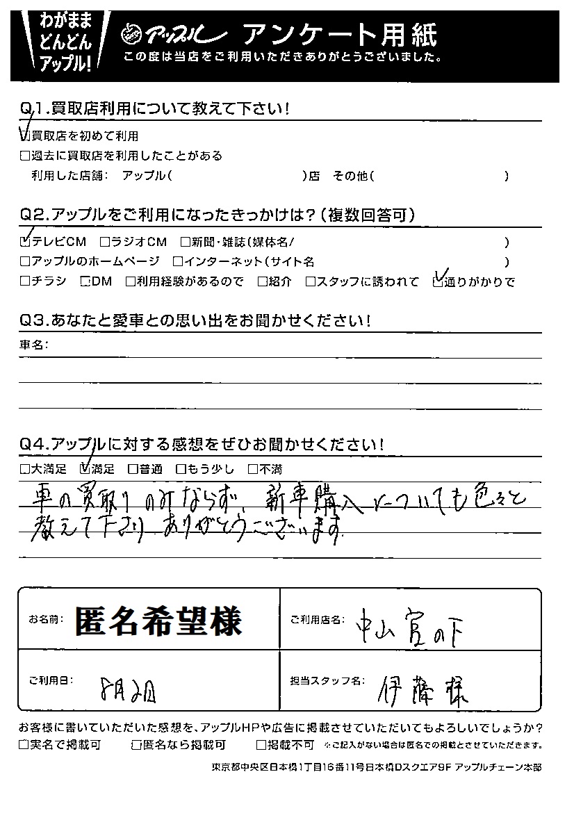 お車のご相談・ 査定だけでもOK! カンタン 入力 30秒 アップルがブランド買取始めました! お電話でも受付中! 受付時間10:00 ~ 19:00(最終受付は18:30となります) 045-929-2211 お車のご相談・ 査定だけでもOK! カンタン 入力 30秒 アップルがブランド買取始めました! お電話でも受付中! 受付時間10:00 ~ 19:00(最終受付は18:30となります) 045-929-2211 アップルがブランド買取始めました! お電話でも受付中! 受付時間10:00 ~ 19:00(最終受付は18:30となります) 045-929-2211 店舗情報 在庫車 スタッフ紹介 ブログ お客様の声 キャンペーン お得 無料査定 click お客様の声 ご記入日: 2021/08/02 匿名希望様 車名:三菱 eKワゴン この度は、アップル中山宮の下店にご来店頂き誠にありがとうございました。また、アンケートにもお答え頂きありがとうございます。次のお車のご購入のお話が進みましたら、また是非お気軽に当店にご相談下さい。次回のご来店、お待ちしております。 前へ 次へ お客様の声一覧を見る