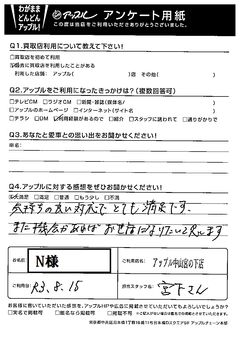 お車のご相談・ 査定だけでもOK! カンタン 入力 30秒 アップルがブランド買取始めました! お電話でも受付中! 受付時間10:00 ~ 19:00(最終受付は18:30となります) 045-929-2211 お車のご相談・ 査定だけでもOK! カンタン 入力 30秒 アップルがブランド買取始めました! お電話でも受付中! 受付時間10:00 ~ 19:00(最終受付は18:30となります) 045-929-2211 アップルがブランド買取始めました! お電話でも受付中! 受付時間10:00 ~ 19:00(最終受付は18:30となります) 045-929-2211 店舗情報 在庫車 スタッフ紹介 ブログ お客様の声 キャンペーン お得 無料査定 click お客様の声 ご記入日: 2021/08/15 横浜市 N様 車名:フィアット 500(チンクエチェント) 前回に引き続き今回もご利用頂きましてありがとうございます。今回のご利用も満足いただけて担当者としては嬉しく思います。いつでも当店をご利用いただいて良かったと思っていただけるようにこれからも頑張らさせていただきます。 前へ 次へ お客様の声一覧を見る
