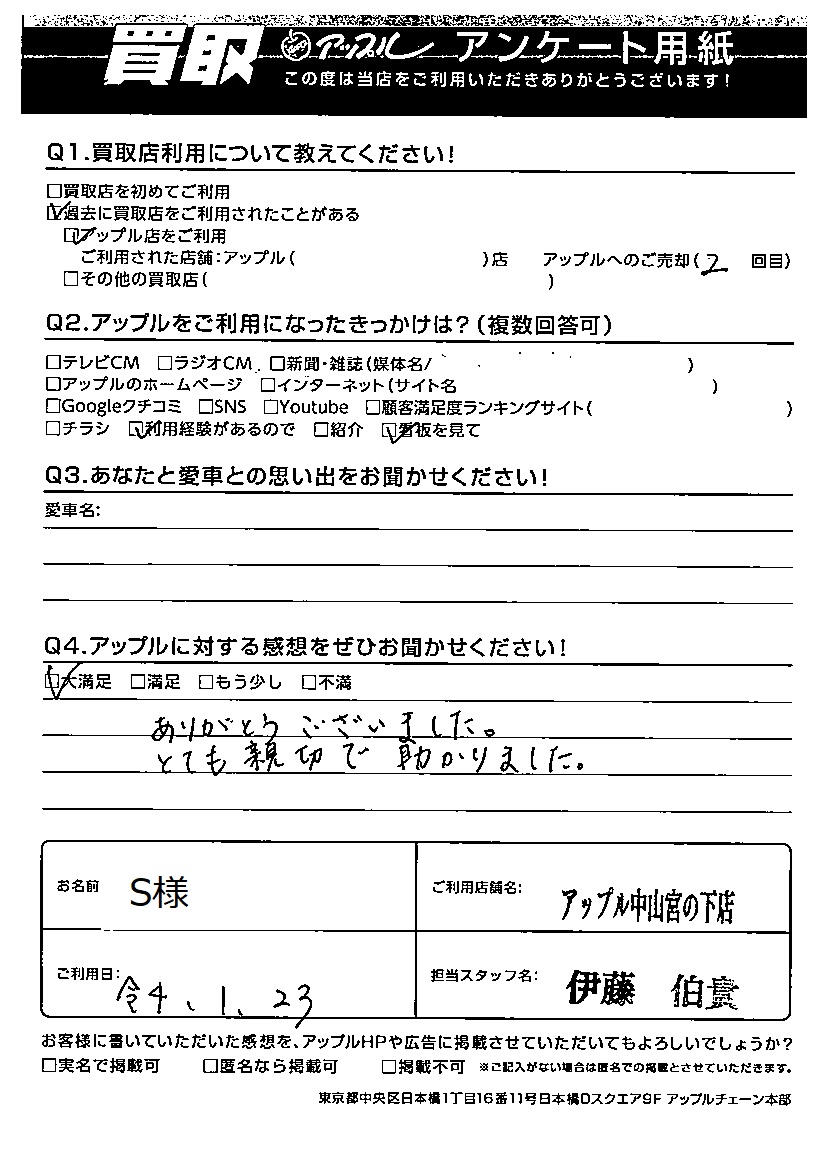 お車のご相談・ 査定だけでもOK! カンタン 入力 30秒 アップルがブランド買取始めました! お電話でも受付中! 受付時間10:00 ~ 19:00(最終受付は18:30となります) 045-929-2211 お車のご相談・ 査定だけでもOK! カンタン 入力 30秒 アップルがブランド買取始めました! お電話でも受付中! 受付時間10:00 ~ 19:00(最終受付は18:30となります) 045-929-2211 アップルがブランド買取始めました! お電話でも受付中! 受付時間10:00 ~ 19:00(最終受付は18:30となります) 045-929-2211 店舗情報 在庫車 スタッフ紹介 ブログ お客様の声 キャンペーン お得 無料査定 click お客様の声 ご記入日: 2022/01/23 S様 車名:フォルクスワーゲン ゴルフ 二度目のご利用、誠にありがとうございます。リピートして頂ける事は長く営業しているうえで何よりもの励みになります。次回も機会がございましたら是非アップル中山宮の下店にご相談下さい。この度は、当店をご利用いただきまして本当にありがとうございました。 前へ 次へ お客様の声一覧を見る