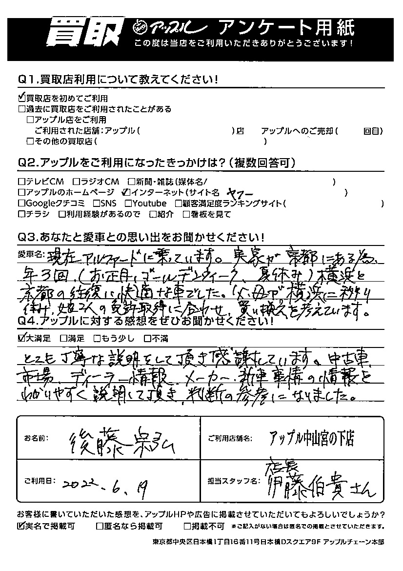 この度は、アップル中山宮の下店をご利用いただきありがとうございます。新車のご購入をご検討されているとの事で、もう少し愛車のお手放しの時期は先になるとは思いますが、その時期がきましたら買取金額の方でも最大限、頑張らさせて頂きますので、是非またご相談下さい。次回のご来店お待ちしております!!