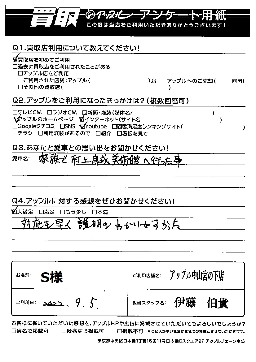 お車のご相談・ 査定だけでもOK! カンタン 入力 30秒 アップルがブランド買取始めました! お電話でも受付中! 受付時間10:00 ~ 19:00(最終受付は18:30となります) 045-929-2211 お車のご相談・ 査定だけでもOK! カンタン 入力 30秒 アップルがブランド買取始めました! お電話でも受付中! 受付時間10:00 ~ 19:00(最終受付は18:30となります) 045-929-2211 アップルがブランド買取始めました! お電話でも受付中! 受付時間10:00 ~ 19:00(最終受付は18:30となります) 045-929-2211 店舗情報 在庫車 スタッフ紹介 ブログ お客様の声 キャンペーン お得 無料査定 click お客様の声 ご記入日: 2022/09/05 S様 車名:日産 ティーダ この度は、思い出がたくさん詰まった、愛車をアップル中山宮の下にご売却頂き、誠にありがとうございました。また、ご趣味のお話も色々とお聞かせ頂き、ありがとうございました。 前へ 次へ お客様の声一覧を見る