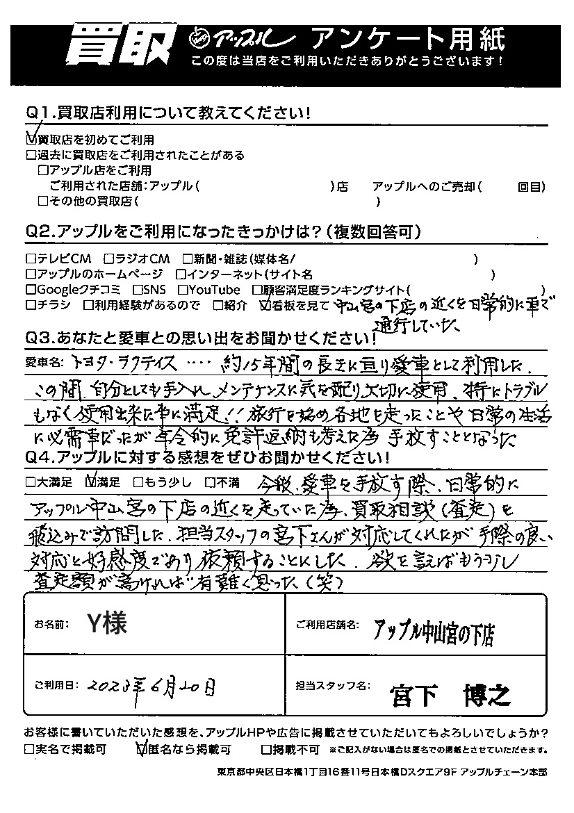 お車のご相談・ 査定だけでもOK! カンタン 入力 30秒 アップルがブランド買取始めました! お電話でも受付中! 受付時間10:00 ~ 19:00(最終受付は18:30となります) 045-929-2211 お車のご相談・ 査定だけでもOK! カンタン 入力 30秒 アップルがブランド買取始めました! お電話でも受付中! 受付時間10:00 ~ 19:00(最終受付は18:30となります) 045-929-2211 アップルがブランド買取始めました! お電話でも受付中! 受付時間10:00 ~ 19:00(最終受付は18:30となります) 045-929-2211 店舗情報 在庫車 スタッフ紹介 ブログ お客様の声 キャンペーン お得 無料査定 click お客様の声 ご記入日: 2023/06/20 Y様 車名:トヨタ ラクティス Y様当店ご利用いただきありがとうございました。大切にされていたラクティスを免許返納の為にお譲り頂きました。大事にしていた愛車を最後まで安全運転していただきました。当店を選んで頂きましてありがとうございました。 前へ 次へ お客様の声一覧を見る