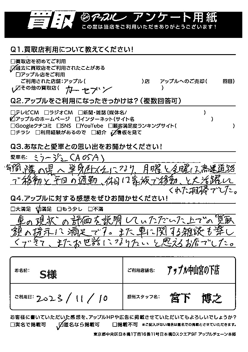 お車のご相談・ 査定だけでもOK! カンタン 入力 30秒 アップルがブランド買取始めました! お電話でも受付中! 受付時間10:00 ~ 19:00(最終受付は18:30となります) 045-929-2211 お車のご相談・ 査定だけでもOK! カンタン 入力 30秒 アップルがブランド買取始めました! お電話でも受付中! 受付時間10:00 ~ 19:00(最終受付は18:30となります) 045-929-2211 アップルがブランド買取始めました! お電話でも受付中! 受付時間10:00 ~ 19:00(最終受付は18:30となります) 045-929-2211 店舗情報 在庫車 スタッフ紹介 ブログ お客様の声 キャンペーン お得 無料査定 click お客様の声 ご記入日: 2024/01/29 S様 車名:三菱 ミラージュ(ハッチバック) ご利用日:2023年11月10日 担当:宮下アップルに対する感想をぜひお聞かせください!車の現状の評価を説明していただいた上での買取額の提示に満足です。また車に関する雑談も楽しくできて、まらお世話になりたいと思えるお店でした。 前へ 次へ お客様の声一覧を見る
