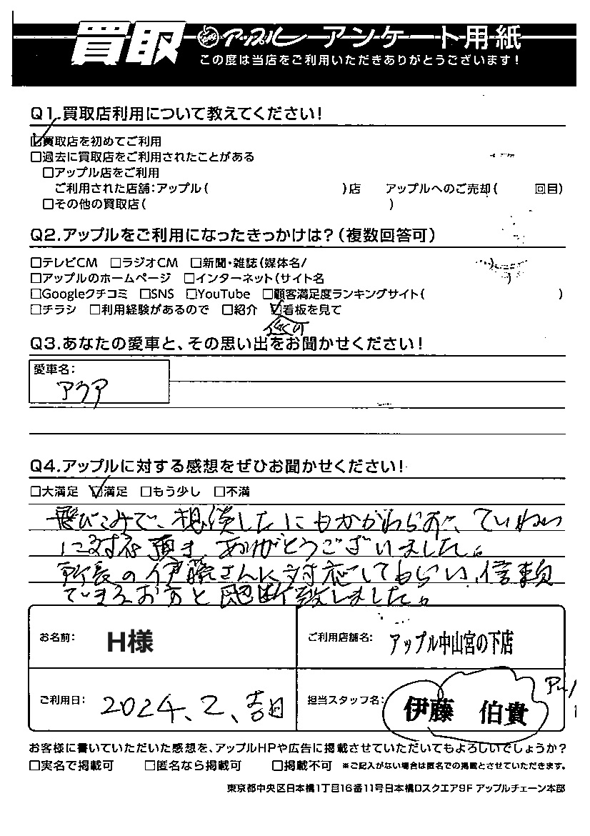 お車のご相談・ 査定だけでもOK! カンタン 入力 30秒 アップルがブランド買取始めました! お電話でも受付中! 受付時間10:00 ~ 19:00(最終受付は18:30となります) 045-929-2211 お車のご相談・ 査定だけでもOK! カンタン 入力 30秒 アップルがブランド買取始めました! お電話でも受付中! 受付時間10:00 ~ 19:00(最終受付は18:30となります) 045-929-2211 アップルがブランド買取始めました! お電話でも受付中! 受付時間10:00 ~ 19:00(最終受付は18:30となります) 045-929-2211 店舗情報 在庫車 スタッフ紹介 ブログ お客様の声 キャンペーン お得 無料査定 click お客様の声 ご記入日: 2024/03/28 H様 車名:トヨタ アクア ご利用日:2024年2月 担当:伊藤伯貴アップルに対する感想をぜひお聞かせください!跳びこみで相談したにもかかわらず、ていねいに対応頂き、ありがとうございました。所長の伊藤さんに対応してもらい信頼できる方と即断致しました。 前へ 次へ お客様の声一覧を見る