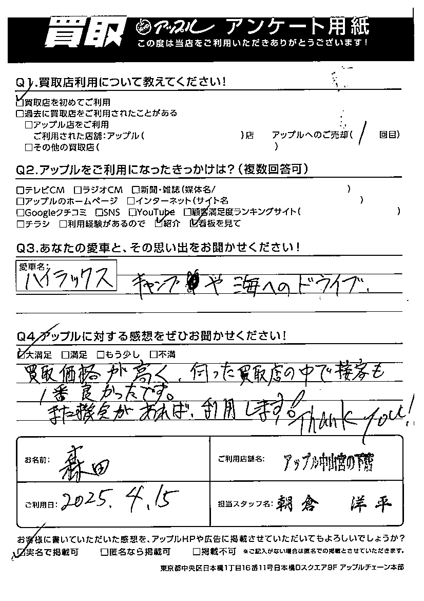 ご愛車 ハイラックス 担当:朝倉