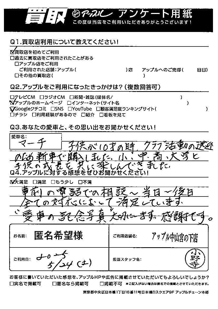 A.愛車名:マーチ 子供が10才の時、クラブ活動の送迎のため新車で購入しました。小・中・高・大学と子供の成長