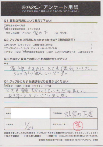 お車のご相談・ 査定だけでもOK! カンタン 入力 30秒 アップルがブランド買取始めました! お電話でも受付中! 受付時間10:00 ~ 19:00(最終受付は18:30となります) 045-929-2211 お車のご相談・ 査定だけでもOK! カンタン 入力 30秒 アップルがブランド買取始めました! お電話でも受付中! 受付時間10:00 ~ 19:00(最終受付は18:30となります) 045-929-2211 アップルがブランド買取始めました! お電話でも受付中! 受付時間10:00 ~ 19:00(最終受付は18:30となります) 045-929-2211 店舗情報 在庫車 スタッフ紹介 ブログ お客様の声 キャンペーン お得 無料査定 click お客様の声 ご記入日: 2018/01/24 T様 とても親切にしていただきました。ありがとうございました。 前へ 次へ お客様の声一覧を見る