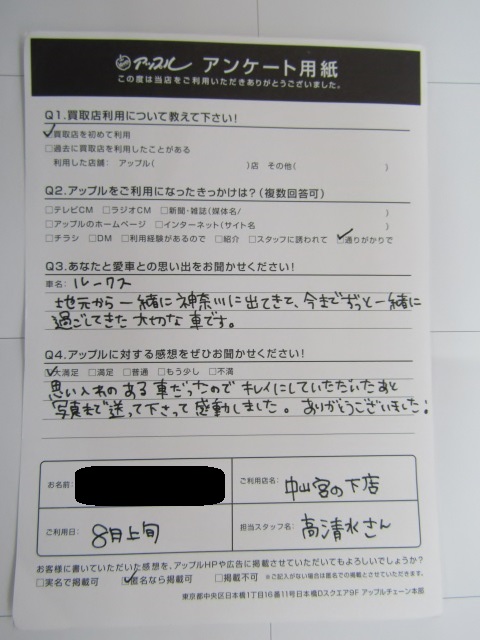 お車のご相談・ 査定だけでもOK! カンタン 入力 30秒 アップルがブランド買取始めました! お電話でも受付中! 受付時間10:00 ~ 19:00(最終受付は18:30となります) 045-929-2211 お車のご相談・ 査定だけでもOK! カンタン 入力 30秒 アップルがブランド買取始めました! お電話でも受付中! 受付時間10:00 ~ 19:00(最終受付は18:30となります) 045-929-2211 アップルがブランド買取始めました! お電話でも受付中! 受付時間10:00 ~ 19:00(最終受付は18:30となります) 045-929-2211 店舗情報 在庫車 スタッフ紹介 ブログ お客様の声 キャンペーン お得 無料査定 click お客様の声 ご記入日: 2019/08/27 Y.H様 車名:日産 ルークス H様 この度は、アップル中山宮の下店をご利用いただき誠にありがとうございます。大切な愛車をお任せいただき重ね重ねお礼申し上げます。また機械がありましたら 是非お立ち寄りください。愛情査定でがんばります。 前へ 次へ お客様の声一覧を見る
