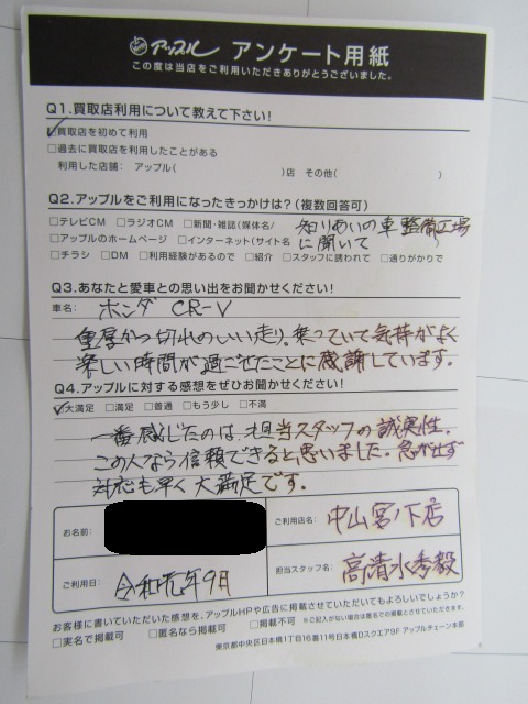 T様 この度はアップル中山宮の下店をご利用いただき誠にありがとうございます。長年愛用されてきたお車もご売却いただき重ね重ねお礼申し上げます。無理なご契約をしない は、私のポリシーでもありますので、そのようなお声をいただけた事をうれしく思います。またイベントなどでお会いできればと思います。ありがとうございました。
