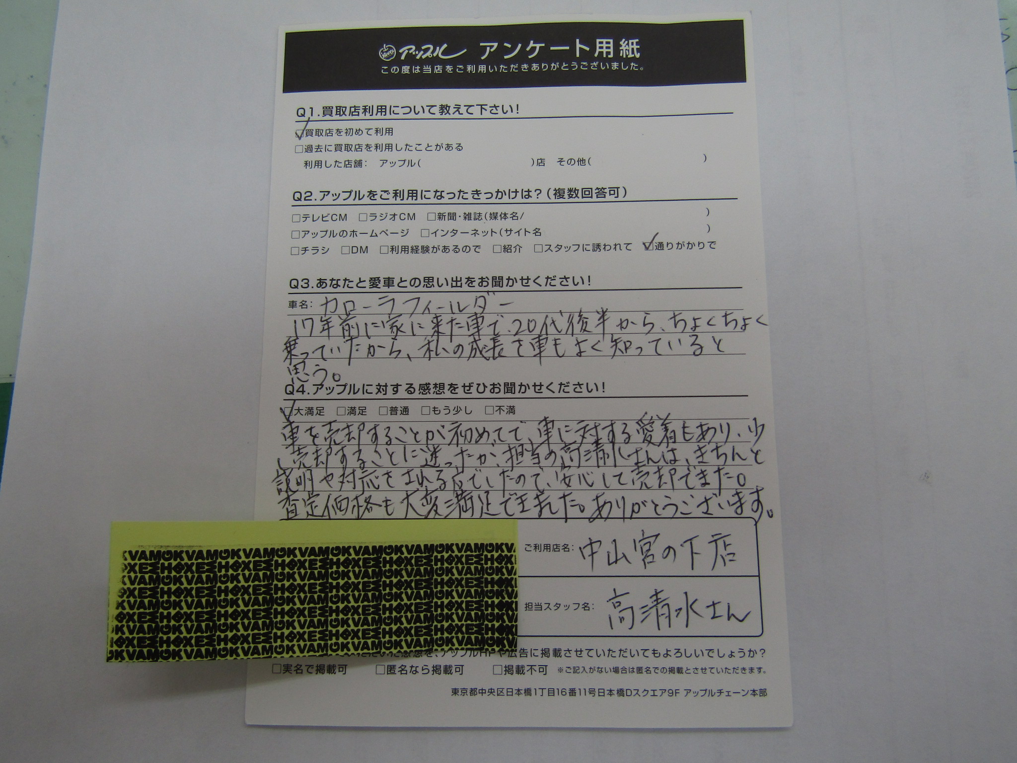 T様 この度は、アップル中山宮の下店をご利用いただき誠にありがとうございます。またこのような高評価をいただき重ね重ねお礼申し上げます。初めてお話しさせていただいた時から、お車に対して愛着をもってらっしゃることが伺えましたので、金額だけでなくしっかりとご納得いただけるようにお話しさせていただきました。ありがとうございます。