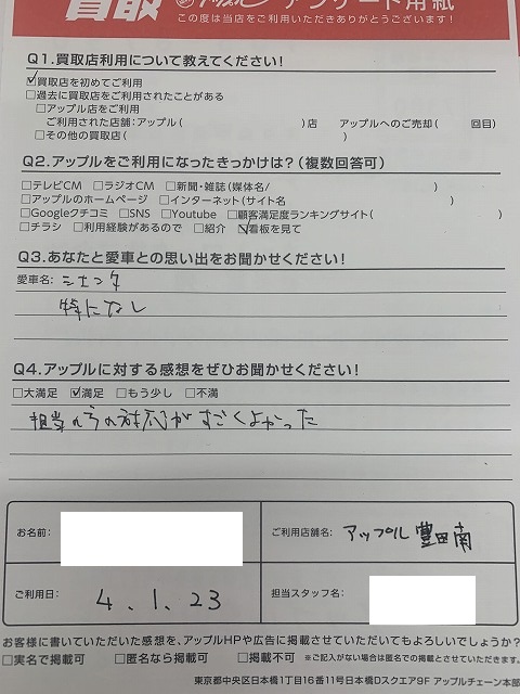 お車のご相談・ 査定だけでもOK! カンタン 入力 30秒 アップルがブランド買取始めました! お電話でも受付中! 受付時間09:30 ~ 18:00 0565-35-6767 お車のご相談・ 査定だけでもOK! カンタン 入力 30秒 アップルがブランド買取始めました! お電話でも受付中! 受付時間09:30 ~ 18:00 0565-35-6767 アップルがブランド買取始めました! お電話でも受付中! 受付時間09:30 ~ 18:00 0565-35-6767 店舗情報 在庫車 スタッフ紹介 ブログ お客様の声 キャンペーン お得 無料査定 click お客様の声 ご記入日: 2022/01/23 K様 車名:トヨタ シエンタ 担当の方の対応がすごくよかった 前へ 次へ お客様の声一覧を見る