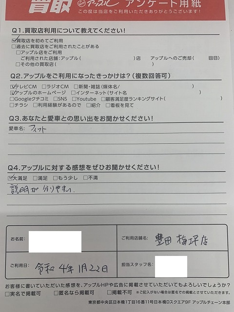 お車のご相談・ 査定だけでもOK! カンタン 入力 30秒 アップルがブランド買取始めました! お電話でも受付中! 受付時間09:30 ~ 18:00 0565-35-6767 お車のご相談・ 査定だけでもOK! カンタン 入力 30秒 アップルがブランド買取始めました! お電話でも受付中! 受付時間09:30 ~ 18:00 0565-35-6767 アップルがブランド買取始めました! お電話でも受付中! 受付時間09:30 ~ 18:00 0565-35-6767 店舗情報 在庫車 スタッフ紹介 ブログ お客様の声 キャンペーン お得 無料査定 click お客様の声 ご記入日: 2022/01/22 T様 車名:ホンダ フィット(H25年9月以降のハイブリッド含む) 説明が分かりやすい 前へ 次へ お客様の声一覧を見る