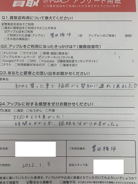 お車のご相談・ 査定だけでもOK! カンタン 入力 30秒 アップルがブランド買取始めました! お電話でも受付中! 受付時間09:30 ~ 18:00 0565-35-6767 お車のご相談・ 査定だけでもOK! カンタン 入力 30秒 アップルがブランド買取始めました! お電話でも受付中! 受付時間09:30 ~ 18:00 0565-35-6767 アップルがブランド買取始めました! お電話でも受付中! 受付時間09:30 ~ 18:00 0565-35-6767 店舗情報 在庫車 スタッフ紹介 ブログ お客様の声 キャンペーン お得 無料査定 click お客様の声 ご記入日: 2022/01/05 M様 対応がとても良かった!時間もかからず、説明も分かりやすかった。 前へ 次へ お客様の声一覧を見る