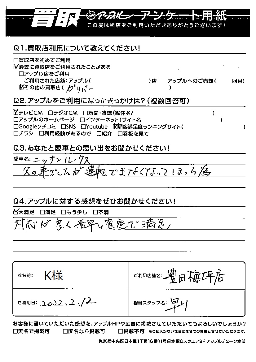 お車のご相談・ 査定だけでもOK! カンタン 入力 30秒 アップルがブランド買取始めました! お電話でも受付中! 受付時間09:30 ~ 18:00 0565-35-6767 お車のご相談・ 査定だけでもOK! カンタン 入力 30秒 アップルがブランド買取始めました! お電話でも受付中! 受付時間09:30 ~ 18:00 0565-35-6767 アップルがブランド買取始めました! お電話でも受付中! 受付時間09:30 ~ 18:00 0565-35-6767 店舗情報 在庫車 スタッフ紹介 ブログ お客様の声 キャンペーン お得 無料査定 click お客様の声 ご記入日: 2022/04/13 K様 車名:日産 ルークス ご利用日:2022/2/12 K様 愛車:日産 ルークス 過去に買取店をご利用したことがある 担当:早川Q あなたと愛車の思い出をお聞かせください!A 愛車名:日産 ルークス 父の車でしたが運転できなくなってしまった為Q アップルに対する感想をお聞かせください!A 対応が良く素早い査定で満足 前へ 次へ お客様の声一覧を見る
