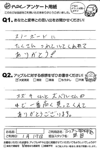 お車のご相談・ 査定だけでもOK! カンタン 入力 30秒 アップルがブランド買取始めました! お電話でも受付中! 受付時間09:30 ~ 18:00 0565-35-6767 お車のご相談・ 査定だけでもOK! カンタン 入力 30秒 アップルがブランド買取始めました! お電話でも受付中! 受付時間09:30 ~ 18:00 0565-35-6767 アップルがブランド買取始めました! お電話でも受付中! 受付時間09:30 ~ 18:00 0565-35-6767 店舗情報 在庫車 スタッフ紹介 ブログ お客様の声 キャンペーン お得 無料査定 click お客様の声 ご記入日: 2013/01/17 匿名希望様 【愛車との思い出】スノーボードにたくさんつれていってくれてありがとう!【アップルに対する感想】スズキさんとスバルさんの中で、一番高く買ってくれてありがとうございます。 前へ 次へ お客様の声一覧を見る