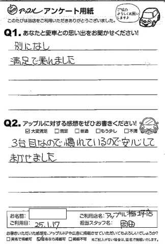 お車のご相談・ 査定だけでもOK! カンタン 入力 30秒 アップルがブランド買取始めました! お電話でも受付中! 受付時間09:30 ~ 18:00 0565-35-6767 お車のご相談・ 査定だけでもOK! カンタン 入力 30秒 アップルがブランド買取始めました! お電話でも受付中! 受付時間09:30 ~ 18:00 0565-35-6767 アップルがブランド買取始めました! お電話でも受付中! 受付時間09:30 ~ 18:00 0565-35-6767 店舗情報 在庫車 スタッフ紹介 ブログ お客様の声 キャンペーン お得 無料査定 click お客様の声 ご記入日: 2013/01/17 匿名希望様 【愛車との思い出】別になし。満足で乗れました。【アップルに対する感想】3台目なので慣れているので安心してまかせました。 前へ 次へ お客様の声一覧を見る
