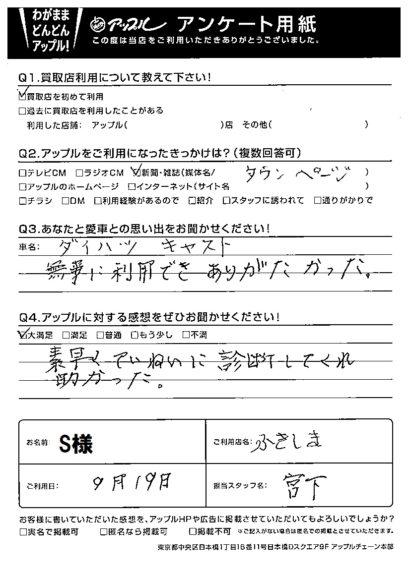 お車のご相談・ 査定だけでもOK! カンタン 入力 30秒 アップルがブランド買取始めました! お電話でも受付中! 受付時間10:00 ~ 19:00 052-601-0355 お車のご相談・ 査定だけでもOK! カンタン 入力 30秒 アップルがブランド買取始めました! お電話でも受付中! 受付時間10:00 ~ 19:00 052-601-0355 アップルがブランド買取始めました! お電話でも受付中! 受付時間10:00 ~ 19:00 052-601-0355 店舗情報 在庫車 スタッフ紹介 ブログ お客様の声 キャンペーン お得 無料査定 click お客様の声 ご記入日: 2021/09/19 S様 車名:ダイハツ キャスト Q:アップルに対する感想をぜひお聞かせください!素早くていねいに診断してくれ助かった。 前へ 次へ お客様の声一覧を見る
