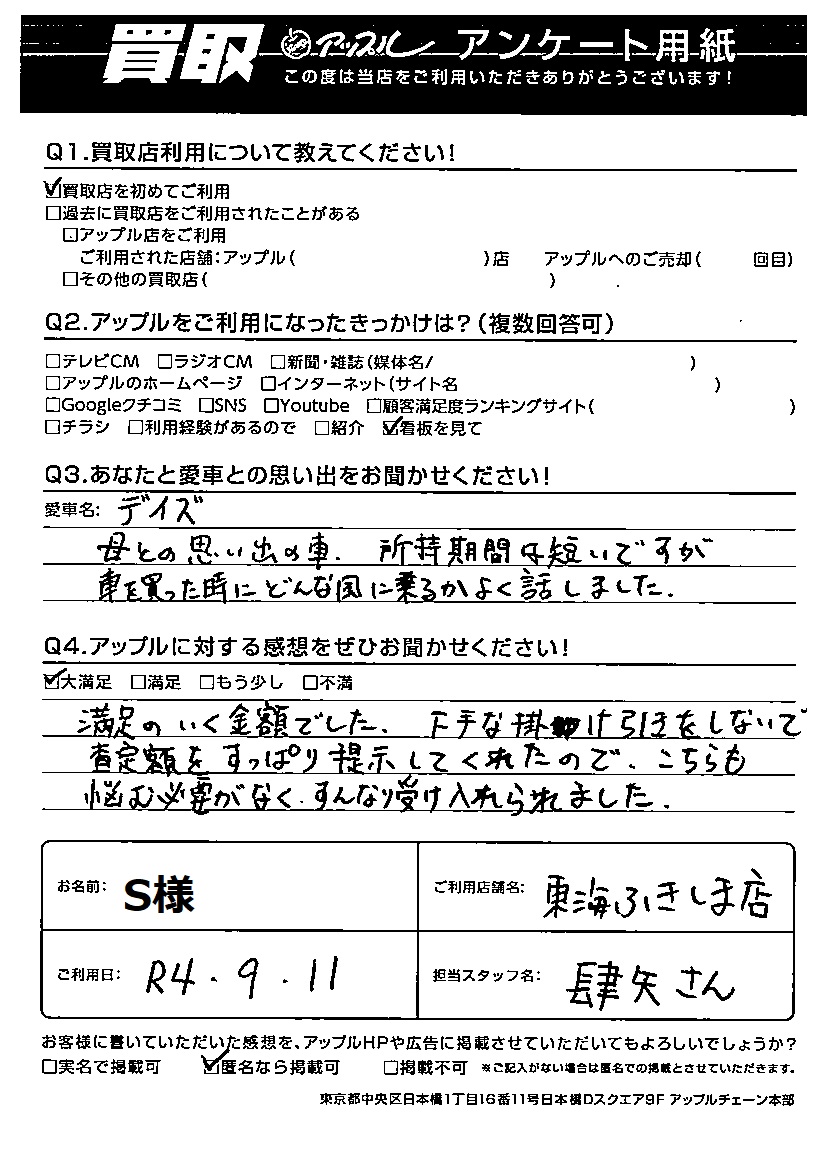 S様 車名:日産 デイズ
