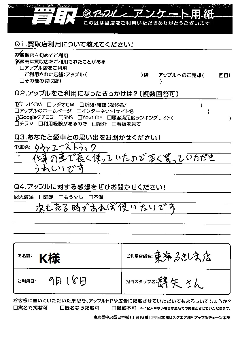 仕事の車で長く使っていたので高く買っていただきうれしいです。