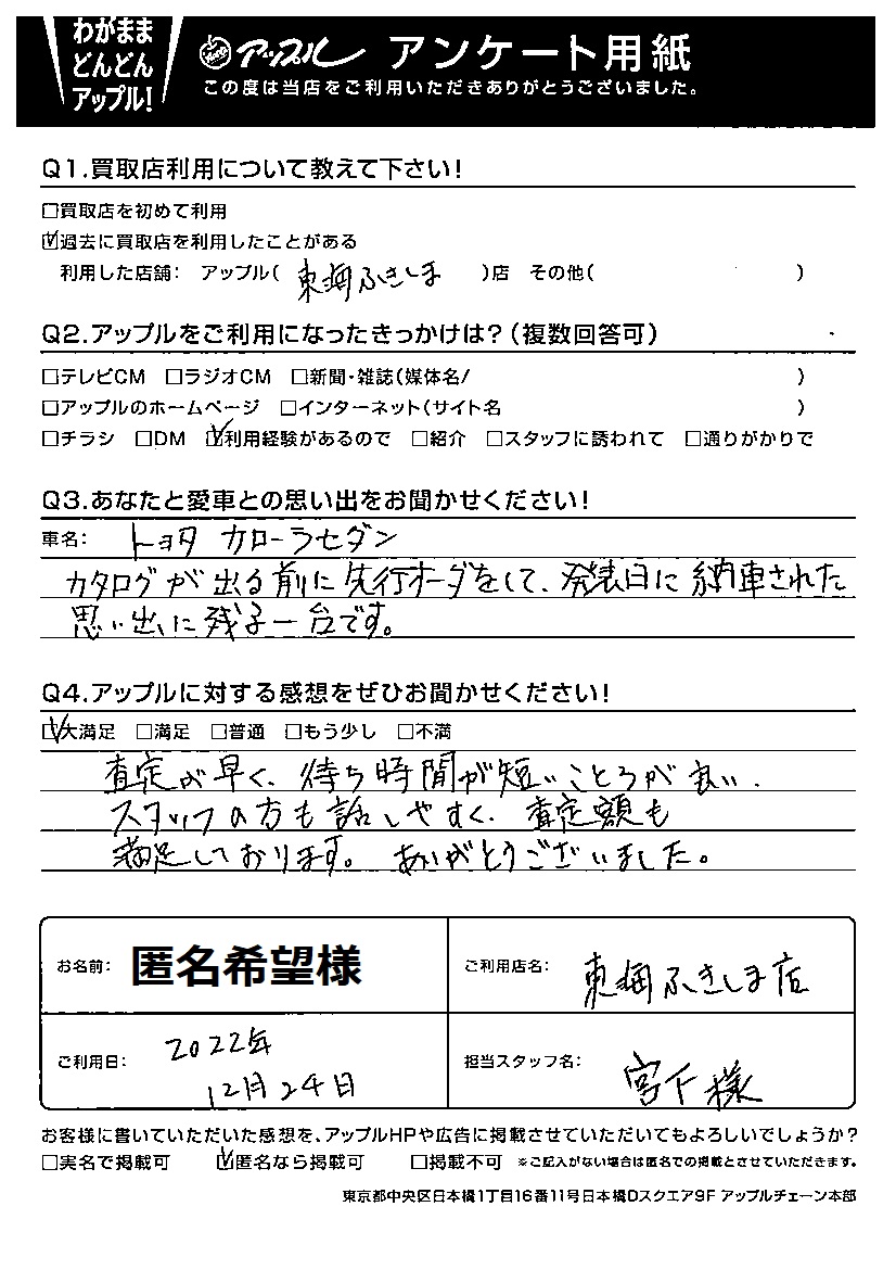 匿名希望様 車名:トヨタ カローラセダン